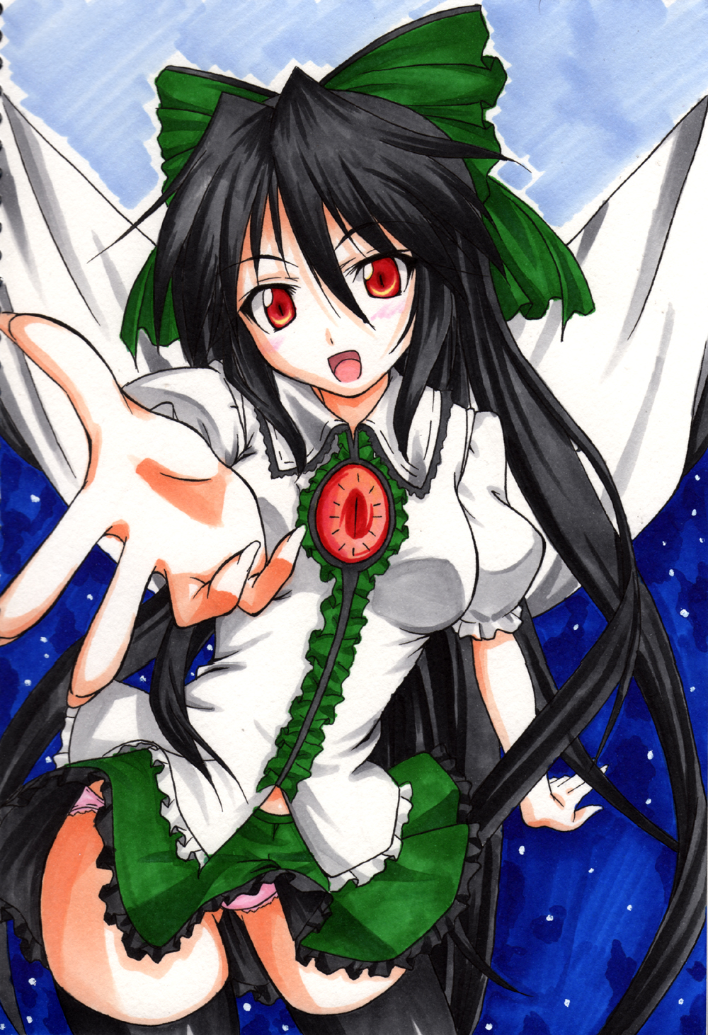 1girlblack hairbreastsfemale focusgradient backgroundopen mouthpantiesred eyesskirtsolothighhighsunderwear
