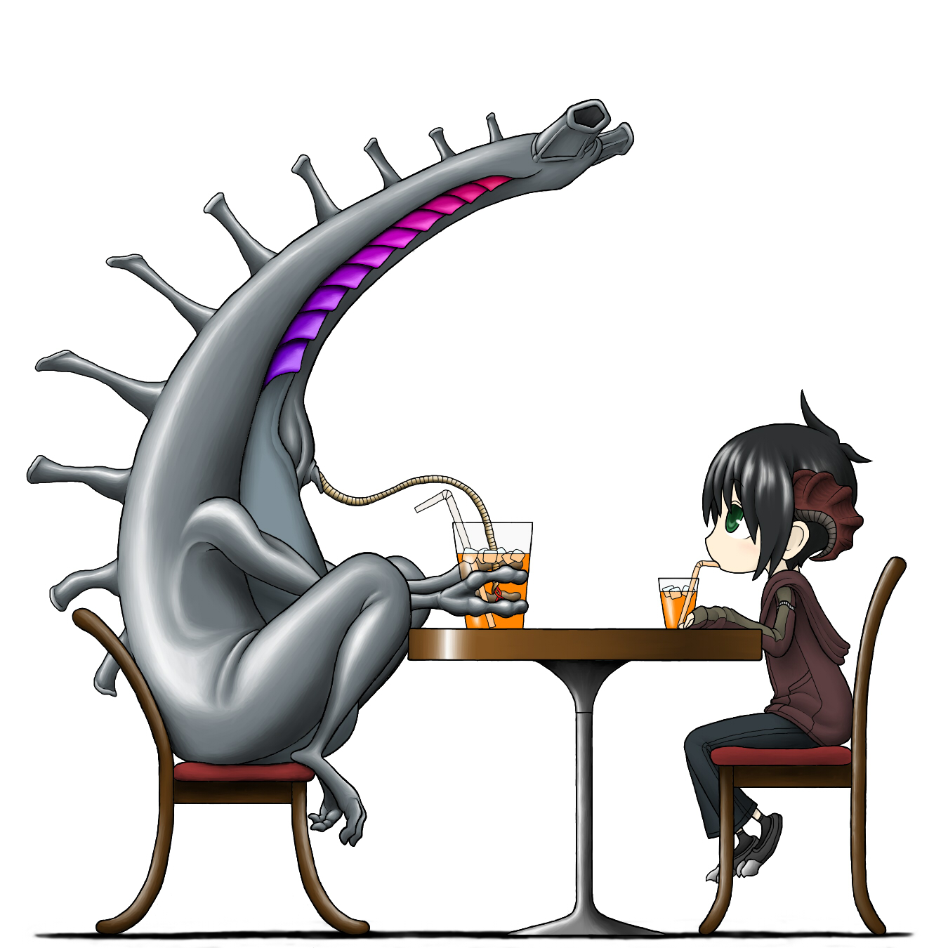 1girlahogeblack hairdemon girldrinkingdrinking strawglassgreen eyeshoodhoodiehornsjuicemonsterorange juiceshort hairwhat