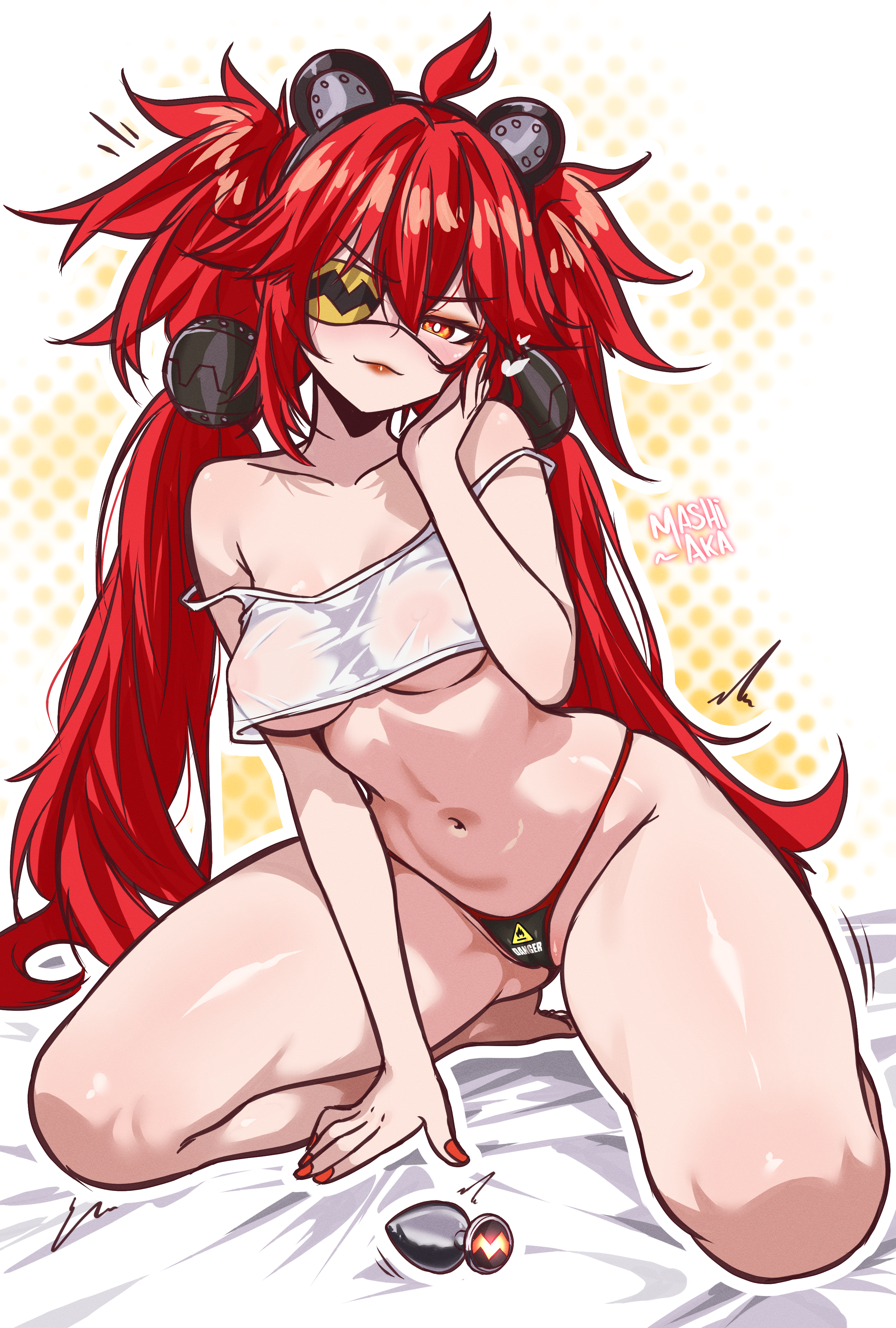 1girlanimal ear hairbandanimal earsbare legsbare shouldersbarefootbear ear hairbandbear earsbedblanketbreastsbutt plugcameltoeclosed mouthcollarbonecrop topeyepatchfake animal earshair ornamenthairbandhand on own faceheartlooking at viewernavelnippleson bedorange eyespantiesred hairred nailssee-through clothessex toysittingsolosphere hair ornamentstomachthighsunderwearwarizawhite background