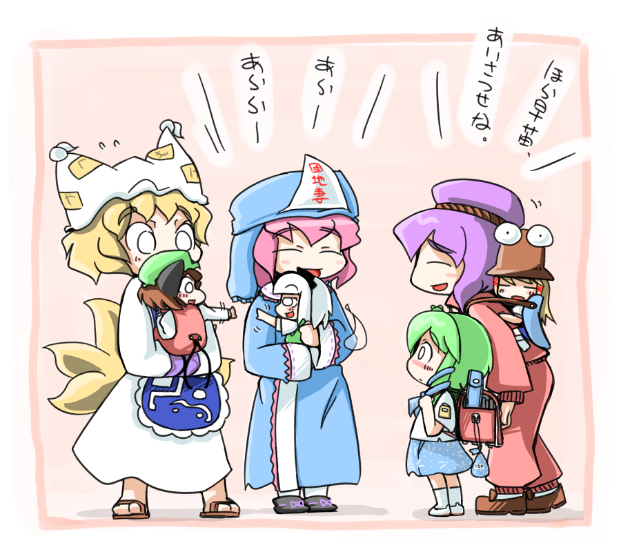 :d1boy6+girlsanimal earsanimal hatbackpackbagcat earscat girlchibichildclosed eyesclothes writingfemale focusfull bodyhatheight differencehitodamalong sleevesmob capmultiple girlso oopen mouthpink backgroundsandalsshoesshort sleevessmilesocksstandingtabardtriangular headpiecewide sleeveszouri