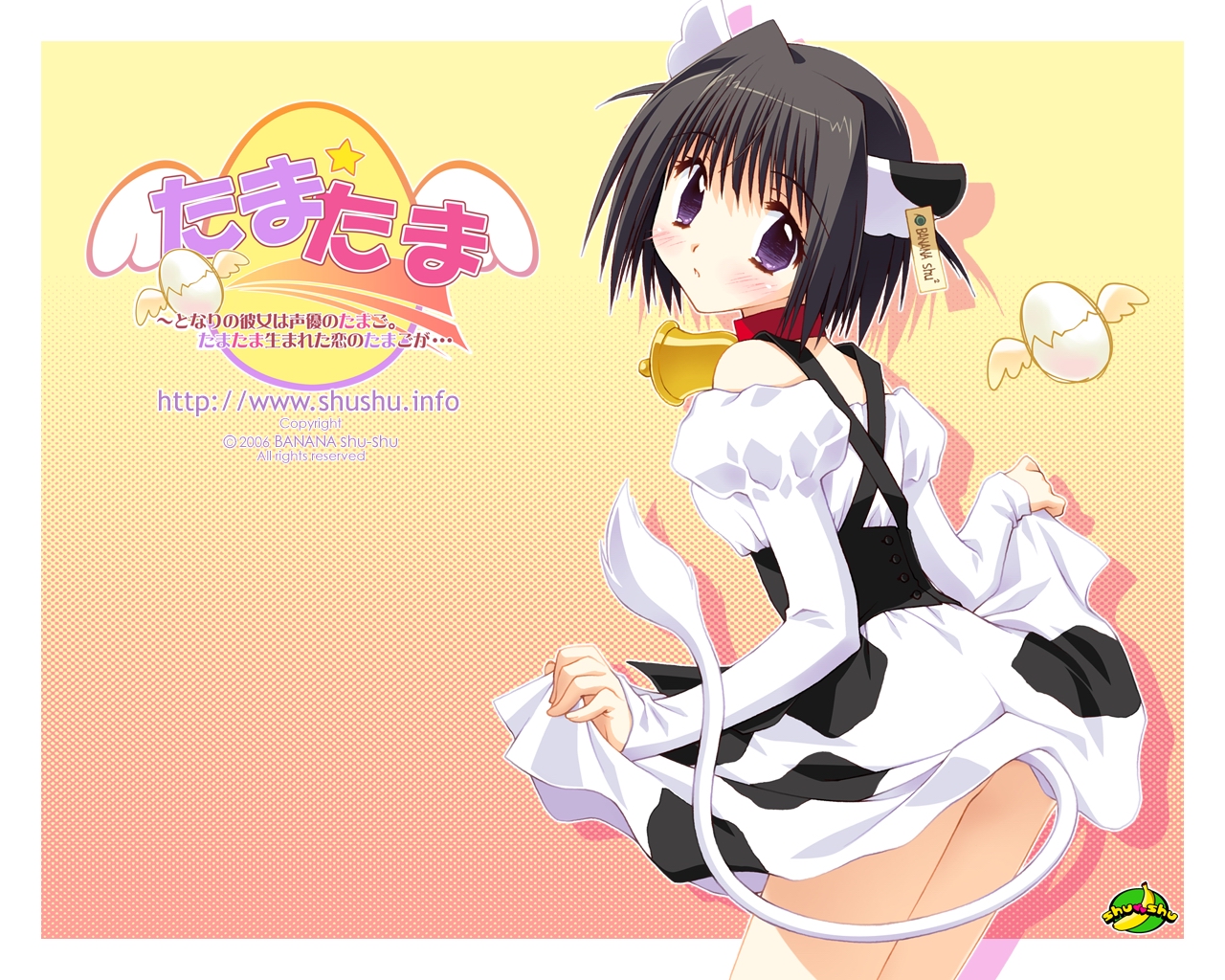 :o1girlanimal earsanimal printbellblack hairblushcollarcopyright namecow earscow girlcow printcow tailcowboy shotdressear tageggfemale focusfrom behindfrom sidegradient backgroundhalftonehalftone backgroundjuliet sleeveslogolong sleeveslooking at viewerlooking backneck bellorange backgroundoutlineoutside borderprint dresspuffy sleevespurple eyesshort hairskirt holdsolotailtaremewatermarkweb address