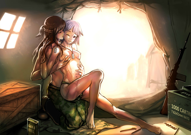 2girlsbarefootbootsbreast grabbreastsbrown haircamouflageclosed eyescratedog tagsear bitingfemaleFlag for Deletiongunkneelinglong hairmilitarymultiple girlsnavelnipplespantiespurple eyesshort hairsilver hairtoplessunderwearwavy mouthweaponwinceyuri