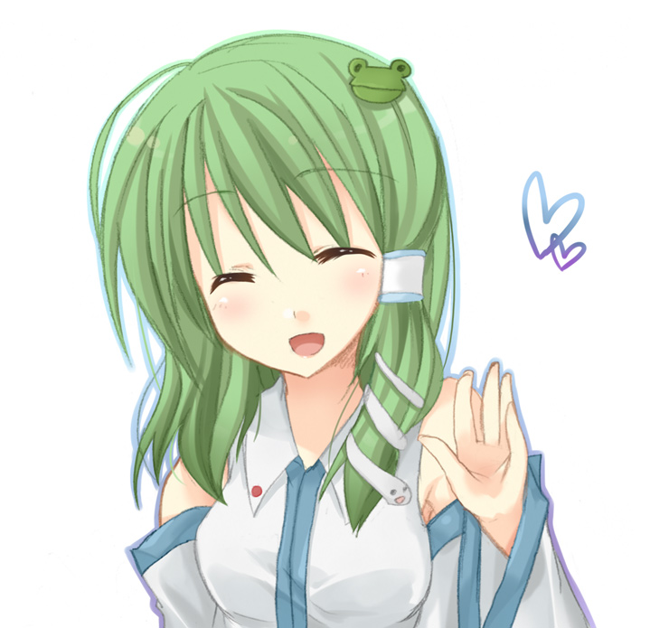 1girlbreastsclosed eyesdetached sleevesfemale focusgreen hairheartshort hairsimple backgroundsmilesnakesoloupper bodywavingwhite background