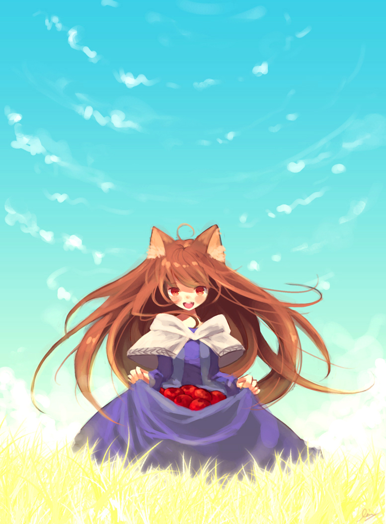 00sanimal earsapplebrown hairdressfoodfruitlong hairred eyesskirtskirt basketsmilesolotailwheatwolf ears