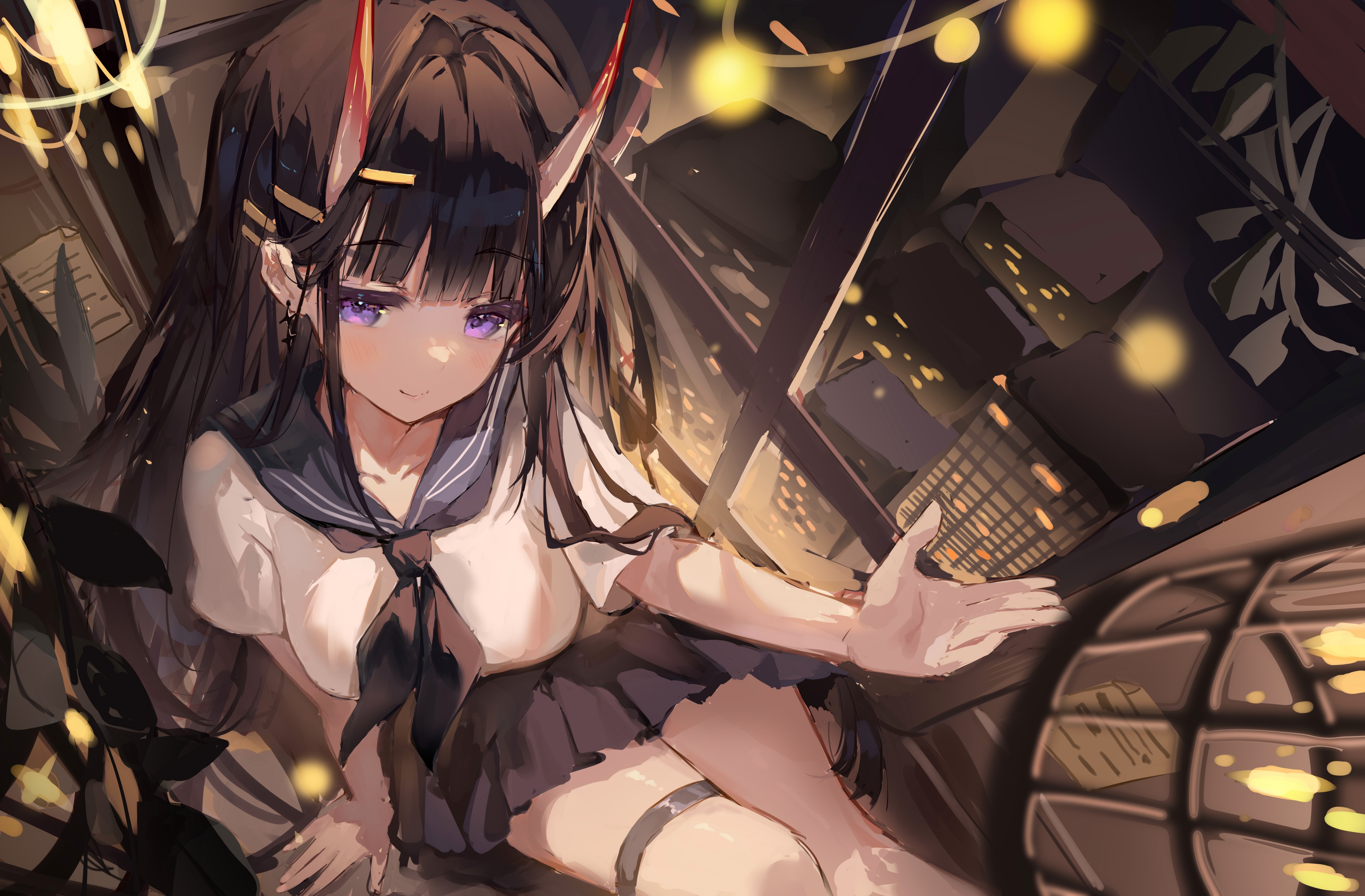 1girlbirdcageblack neckerchiefblack sailor collarbreastsbrown hairbrown skirtcageearringsfrom abovehornsjewelrylong hairmedium breastsminiskirtneckerchiefpurple eyessailor collarschool uniformshirtshort sleevesskirtsolothigh strapvery long hairwhite shirt