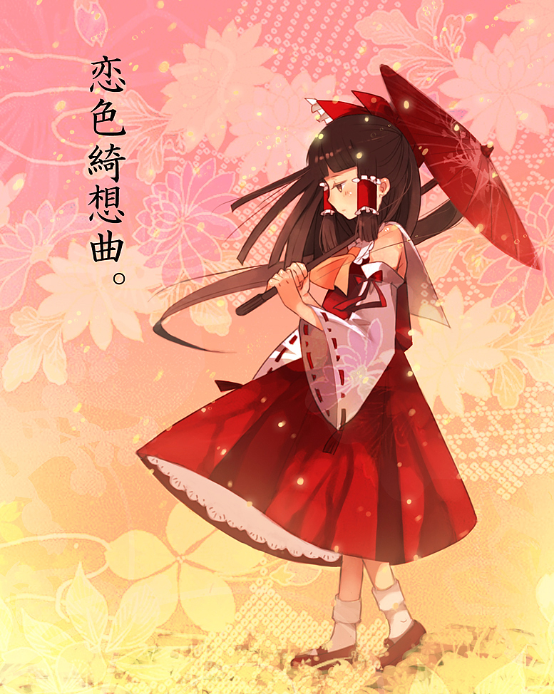 1girlblunt bangsbowbrown eyesbrown hairchinese textdetached sleevesexpressionlessfemale focusflowerhair bowhair tubesjapanese clothesleaflong hairlooking downmary janesmikooil-paper umbrellapetticoatprofileribbonshoesskirtsoloumbrellawalkingwind