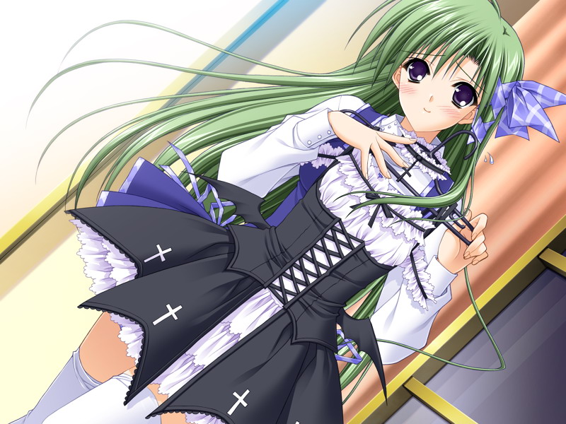 mint blancmanche, galaxy angel, 00s, 1girl, animal ears, blue hair, blush, character name, english text, engrish text, female focus, looking at viewer, ranguage, short hair, solo, thighhighs, valentine