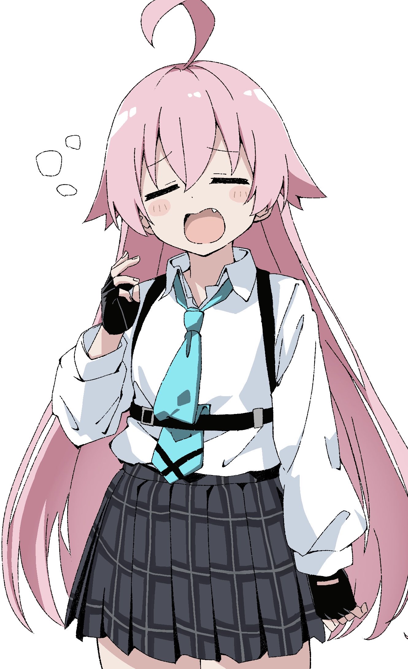 1girlaqua necktieblushclosed eyesfangfingerless glovesgloveslong hairnecktieopen mouthpink hairskirtsoloyawning