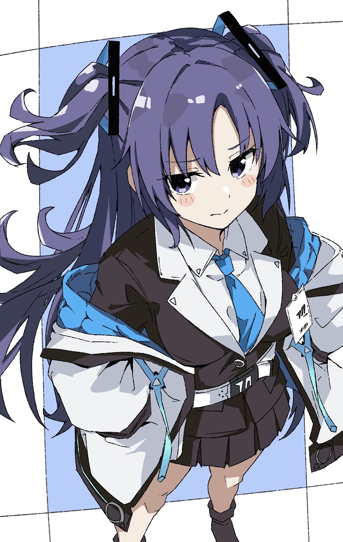 1girlblushclosed mouthjacketlong hairlooking at viewernecktieopen clothesopen jacketpurple eyespurple hairskirtsolo