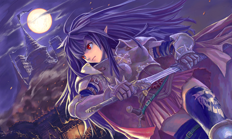 1girlarmorarmored dressblue hairdressfemale focusgauntletslong hairoutdoorspointy earsskirtskysoloswordthighhighsweaponzettai ryouiki