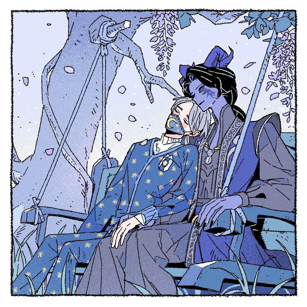 2boysblack hairblack pantsblue hornsblue sclerablue skinblushclosed eyescolored scleracolored skincurled hornsfacial markfalling petalsfingernailsgrassgrey hairgrey shirthigh collarhornsleaning on personmale focusmaskmouth maskmultiple boysnakainaka4383pajamaspantspetalspuffy sleevessharp fingernailsshirtsolid eyesswing settreeturtleneckyaoi