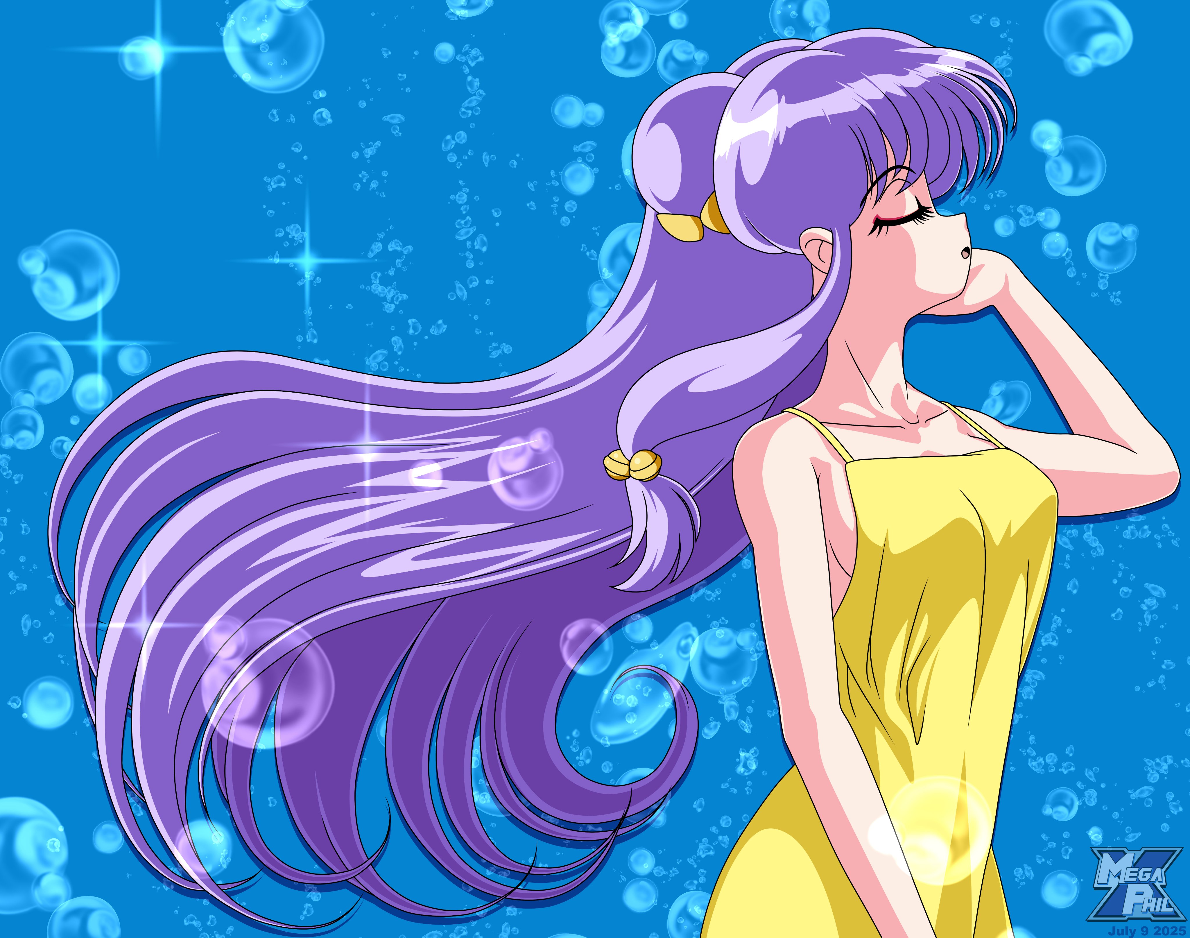 1girlbellblue backgroundbreastsbubbleclosed eyesdouble bundresshair bellhair bunhair ornamentlong hairmedium breastspurple hairsideboobsoloyellow dress