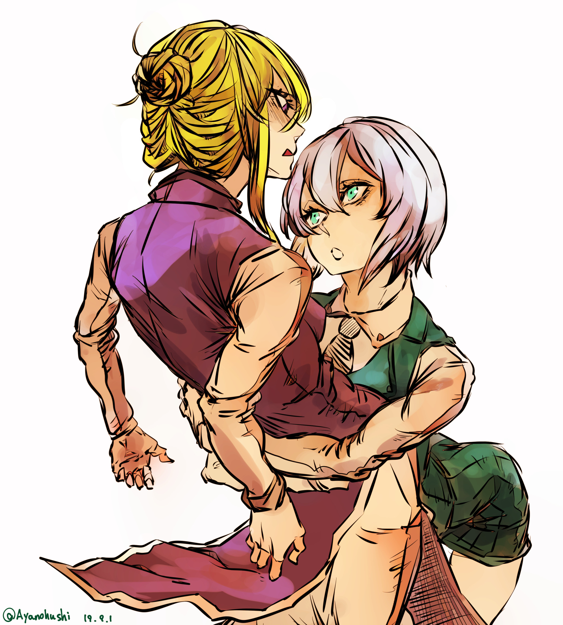 2girlsarms around waistblack skirtblonde hairblue eyesdateddressface-to-faceflusteredgreen hairgreen ribbonhair bunhuglong sleeveslooking at anothermultiple girlsopen mouthpleated skirtpurple tabardribbonshirtsingle hair bunskirttabardtwitter usernamewhite dresswhite shirtyuri