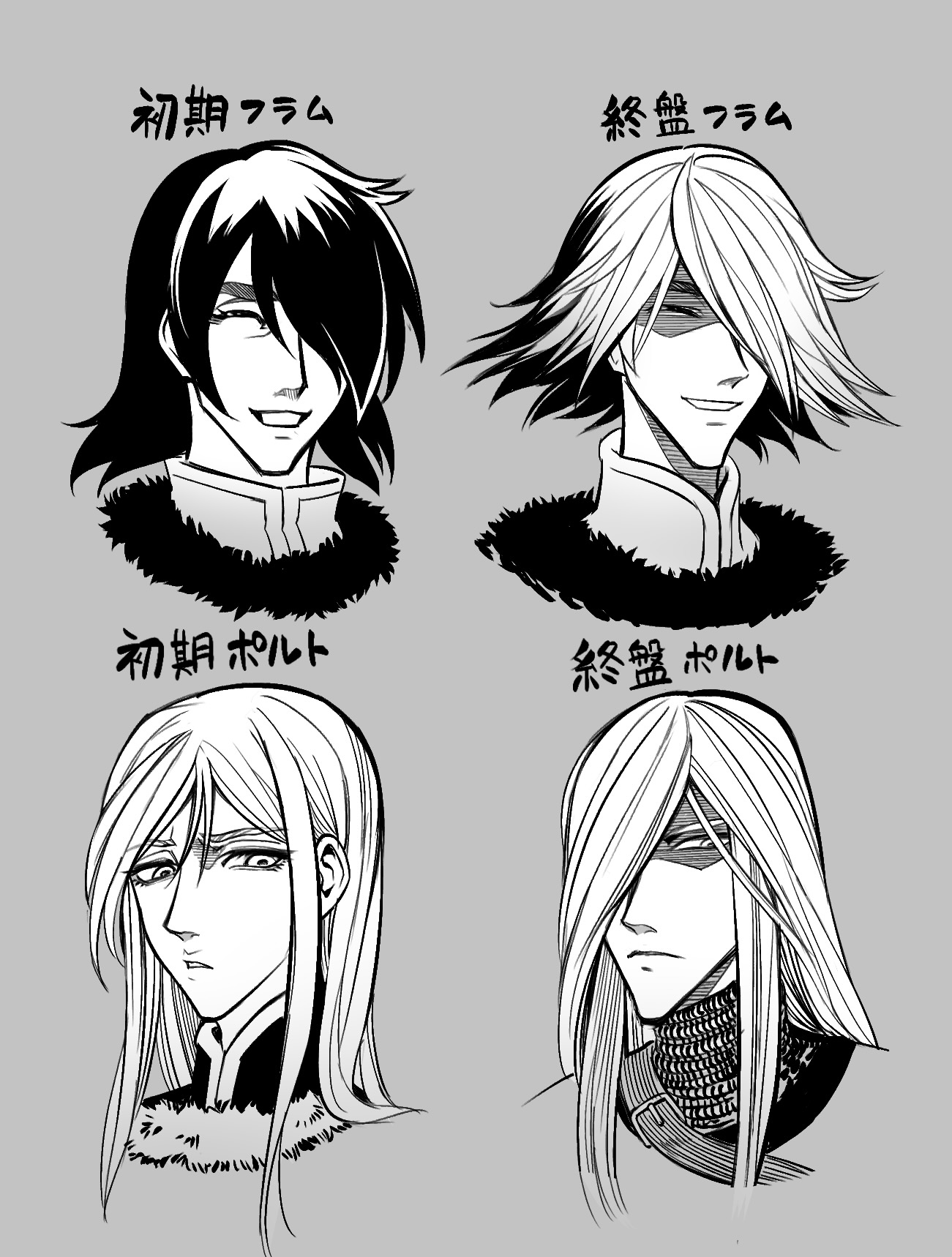 2boysarmorblack hairblonde hairchainmailchanging artstyleclosed eyesclosed mouthcomparisonfur trimhair over one eyehigh collarkuji mitsuhisa (style)leopold (wolfsmund)male focusmedium hairmonochromemulticolored hairmultiple boysopen mouthsmiletwo-tone hairwhite hair