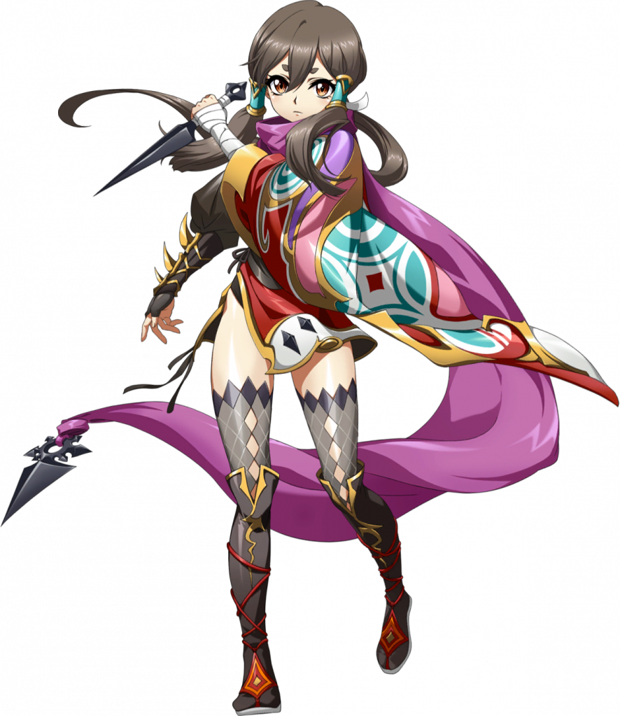 1girlbandaged armbandagesblack bootsblack thighhighsbootsbracerbrown hairclosed mouthfull bodyhair between eyeshair tubesholdingholding kunaiholding weaponjapanese clotheskimonokunailight frownlooking at viewerninjaorange eyesponytailpurple scarfscarfshort eyebrowsshort kimonoshort yukatasimple backgroundsolostandingtachi-ethighhighstransparent backgroundtsubame (langrisser)two side upweaponyukatazettai ryouiki