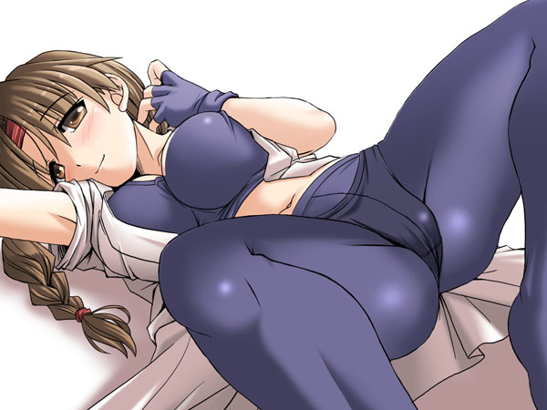 1girlassblushbraidbreastsbreasts squeezed togetherbrown eyesbrown hairdougiembarrassedfemale focusglovesheadbandlarge breastslong hairlyingmidriffnavelopen clothesopen shirtpantylinessashshirtskin tightsockssolospandexsports braspread legsunaligned breastsvery long hair