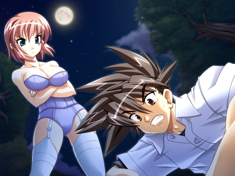 1boy1girlangryblack eyesbreastsbrown eyesbrown haircleavageclenched teethcorsetcrossed armsfrom belowgarter beltgreen eyesmoonnightoutdoorspantiespink hairpurple pantiesred hairshort hairskyspiked hairteeththighhighsunderwearwhite thighhighs
