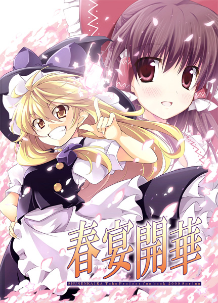 2girlsblonde hairbrown hairfemale focusgrinhatjapanese clotheslong hairmikomultiple girlsred eyesribbonsmilewitchwitch hatyellow eyes