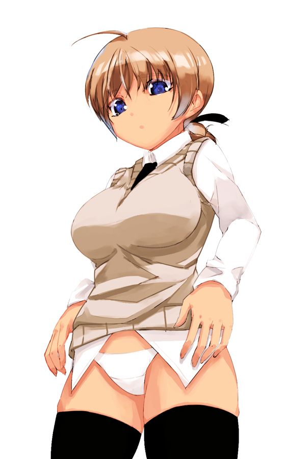 00s1girlahogeblue eyesbottomlessbreastsbrown hairfemale focuslarge breastsno pantspantiesponytailsolosweater vestthighhighsunderwearwhite panties