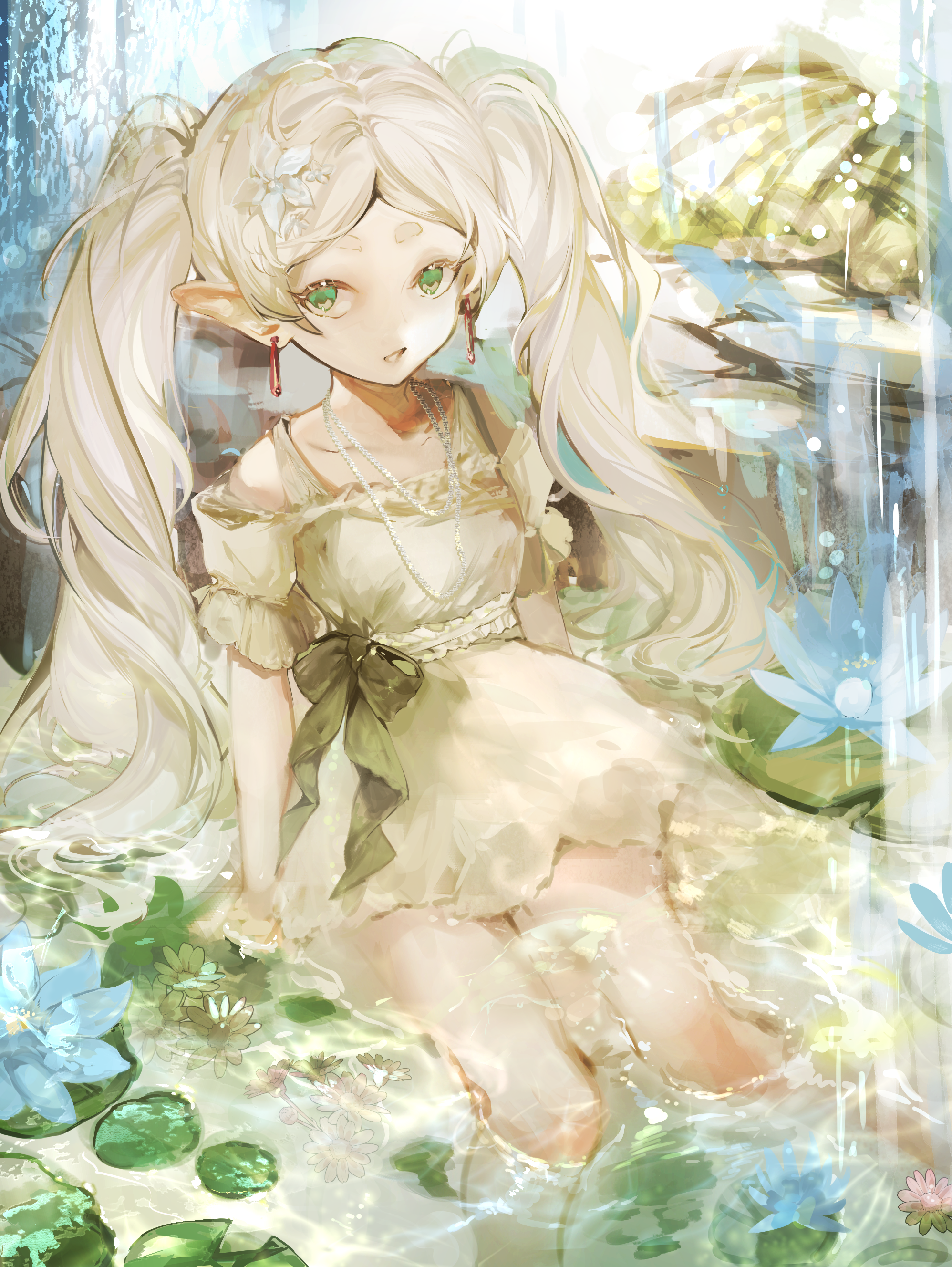1girlaqua flowerbowcollarbonedaydressdress bowearringsflowerfrilled dressfrillsgreen bowgreen dressgreen eyesgreen hairgreen themehair flowerhair ornamentjewelrylily padlong hairlooking at viewernecklaceopen mouthoutdoorspartially submergedpearl necklacepondshort sleevessoloteardrop earringstwintailswater