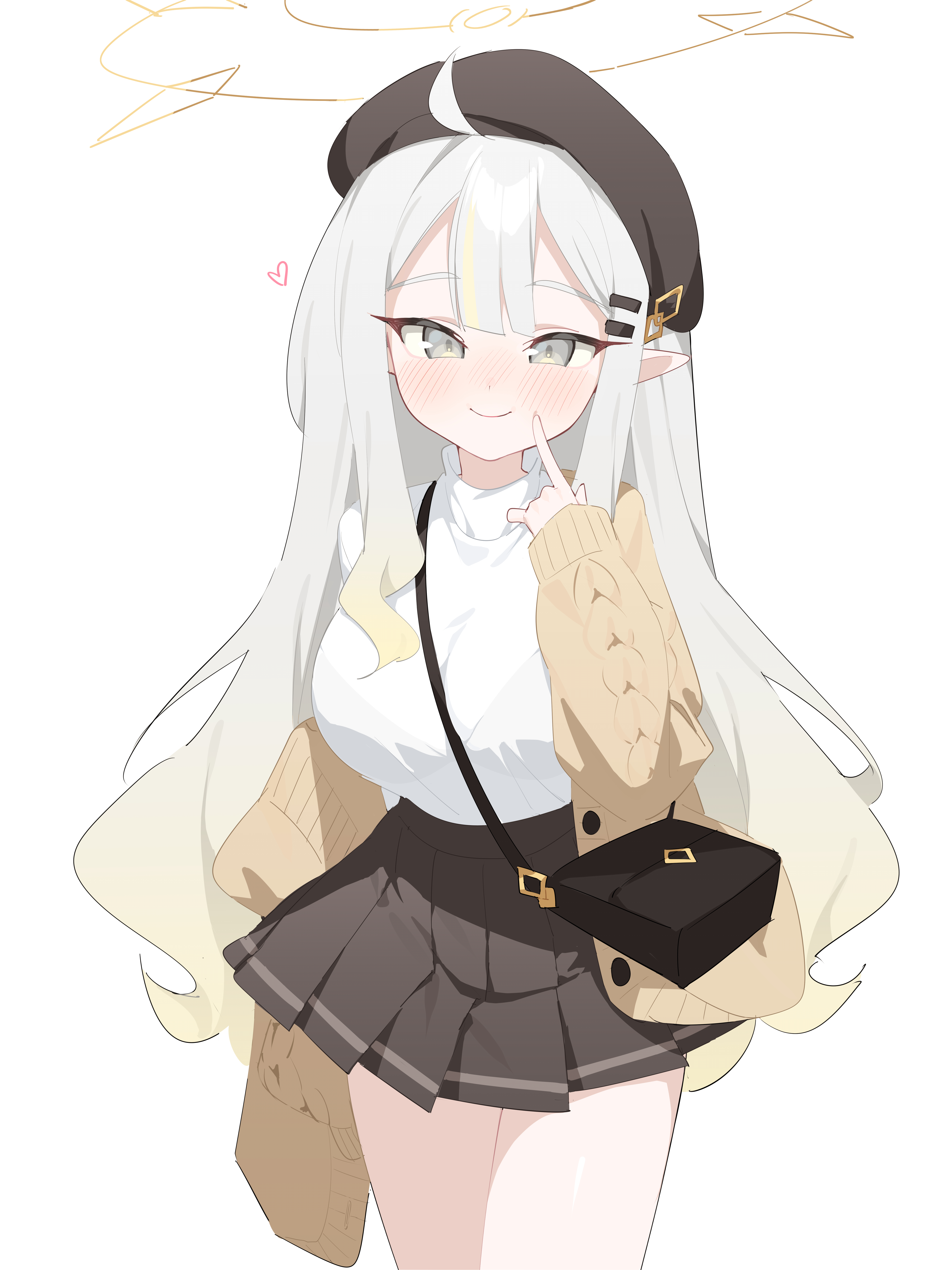 1girlahogeblack bagblonde hairblushbra visible through clothesbreastsbrown skirtcardiganclosed mouthcowboy shotgradient hairgrey eyesgrey hairhaloheartlarge breastslong hairlooking at viewermulticolored hairpointy earssimple backgroundskirtsleeves past wristssmilesolosweaterturtleneckturtleneck sweaterwhite backgroundwhite sweateryellow cardigan