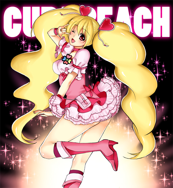 00s1girlblonde hairbootsbowchokerearringsfemale focusfrillshair ornamentheartheart hair ornamentjewelryknee bootslong hairm/magical girlone eye closedpink bootspink bowpink eyessolotwintailswink