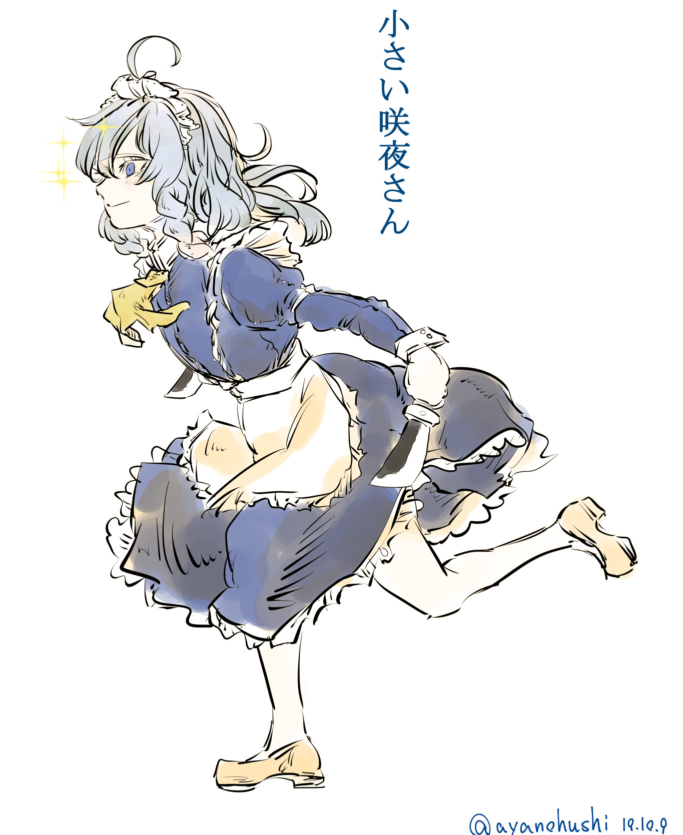 1girlahogeapronascotblue dressblue eyesdateddressfrilled apronfrillsgrey hairholdingholding knifeholding weaponknifelong sleevesmaid headdressmedium hairpuffy sleevesrunningshoessolostandingstanding on one legstar (symbol)twitter usernamewaist apronweaponwhite apronyellow ascotyellow shoes