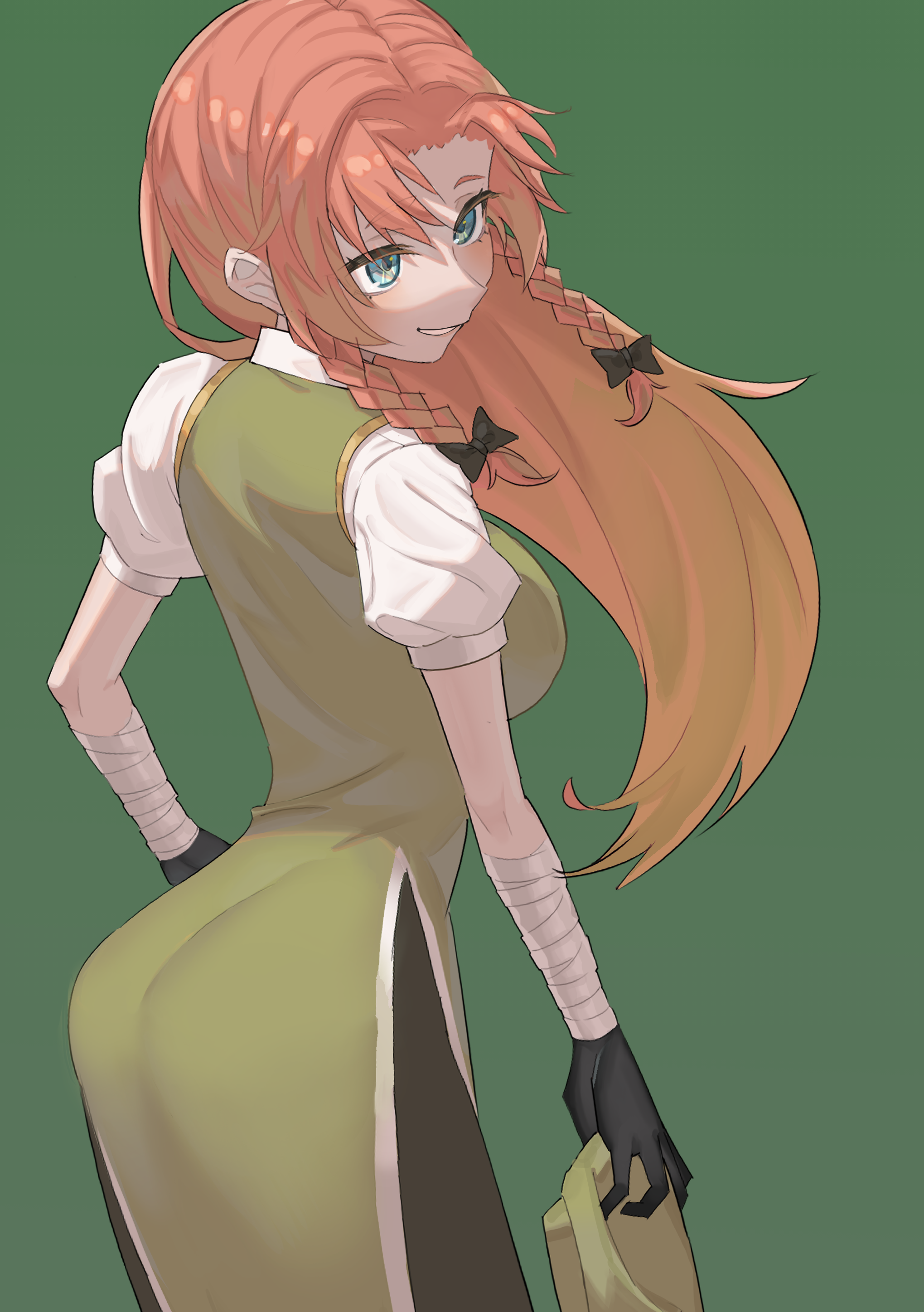 1girlassbandaged armbandagesblack bowblack glovesblack leggingsbowbraidbraided sidelockbreastsdressfloating hairglovesgreen backgroundgreen dresshair bowhatholdingholding unworn clothesholding unworn hatleggingslong hairlooking to the sidemedium breastsorange hairpelvic curtainshirtshort sleevessimple backgroundsmilesolostraight hairtwin braidsunworn hatunworn headwearvery long hairwhite shirt
