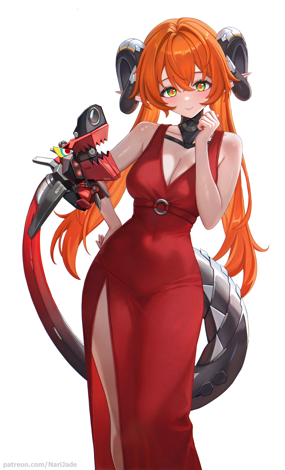 1girlalternate costumebare shouldersbreastscleavageclosed mouthdressgreen eyeshair between eyeshand on own hiphand uphornslarge breastslong dresslong pointy earslooking at viewermechanical hornsmechanical tailorange hairpointy earsred dressred pupilssimple backgroundsmiletailwhite background