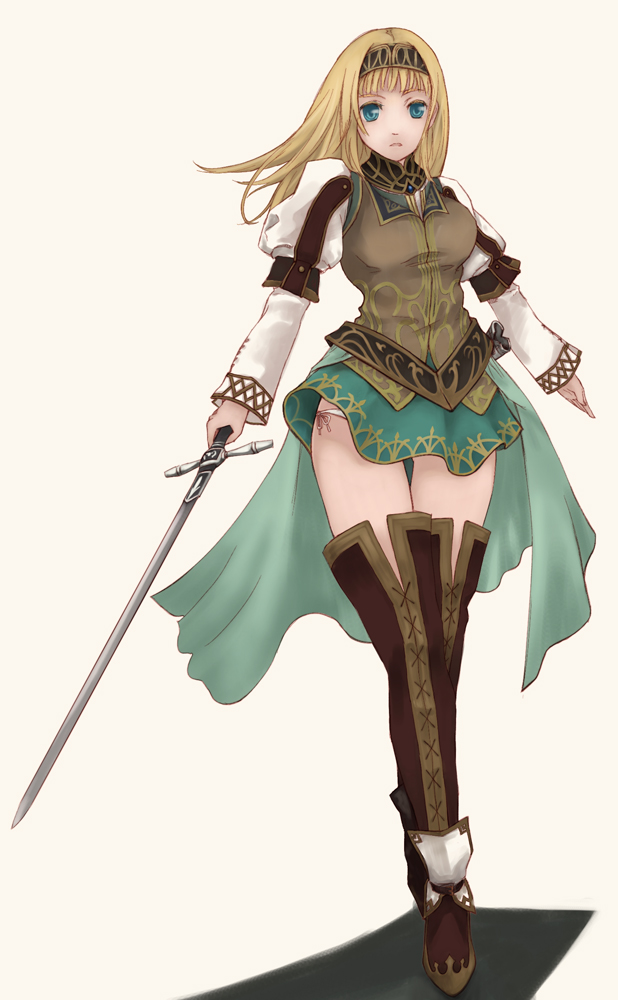 1girlblonde hairblue eyesbootsclothes liftfemale focushairbandlong hairminiskirtoverskirtpantiespantyshotpuffy sleevesside-tie pantiesskirtskirt liftsolostandingswordthigh bootsthighhighsunderwearupskirtweaponwindwind liftzettai ryouiki