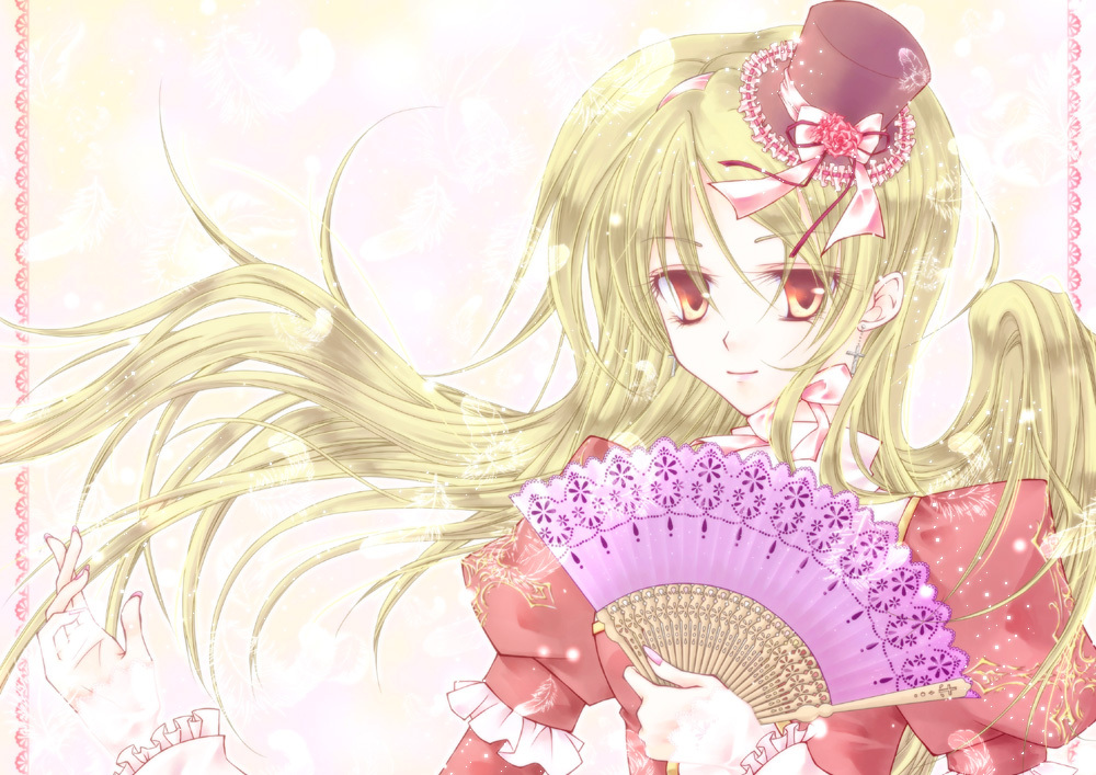 1girlblonde hairbowbrown hatclosed mouthdressfloating hairfolding fanfrilled hatfrilled sleevesfrillshand fanhathat bowholdingholding fanjuliet sleeveslong hairlong sleeveslooking at viewermini hatmini top hatorange eyespuffy sleevesred dresssmilesolotop hatupper bodywhite bow