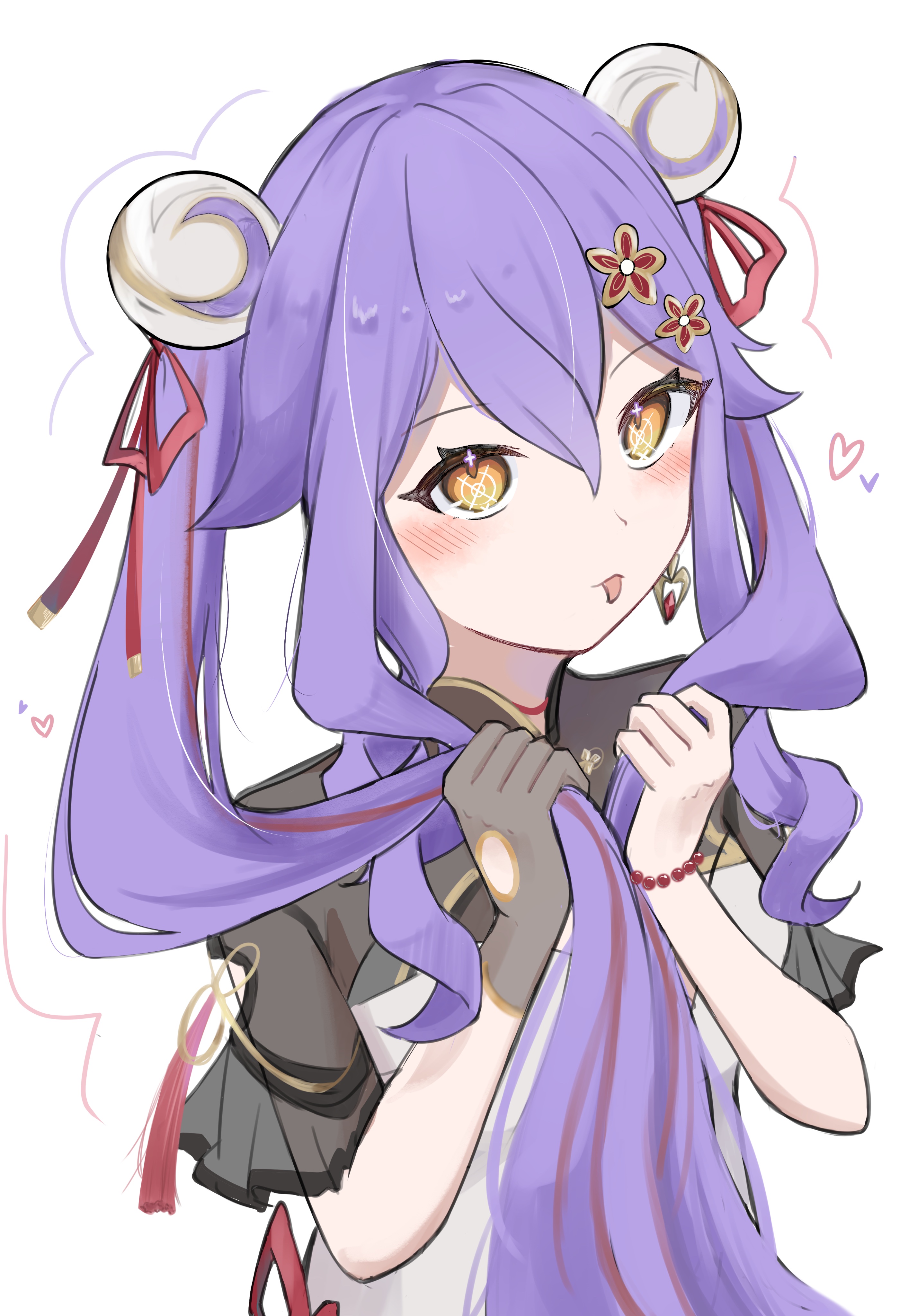 1girlbead braceletbeadsblushbraceletbrown eyesclosed mouthdressearringsglovesgrey gloveshair between eyeshands upholdingholding own hairjewelrylong hairlooking at viewermulticolored hairpurple hairred hairred ribbonribbonshort sleevessimple backgroundsingle glovesolostreaked hairtonguetongue outvery long hairwhite backgroundwhite dress