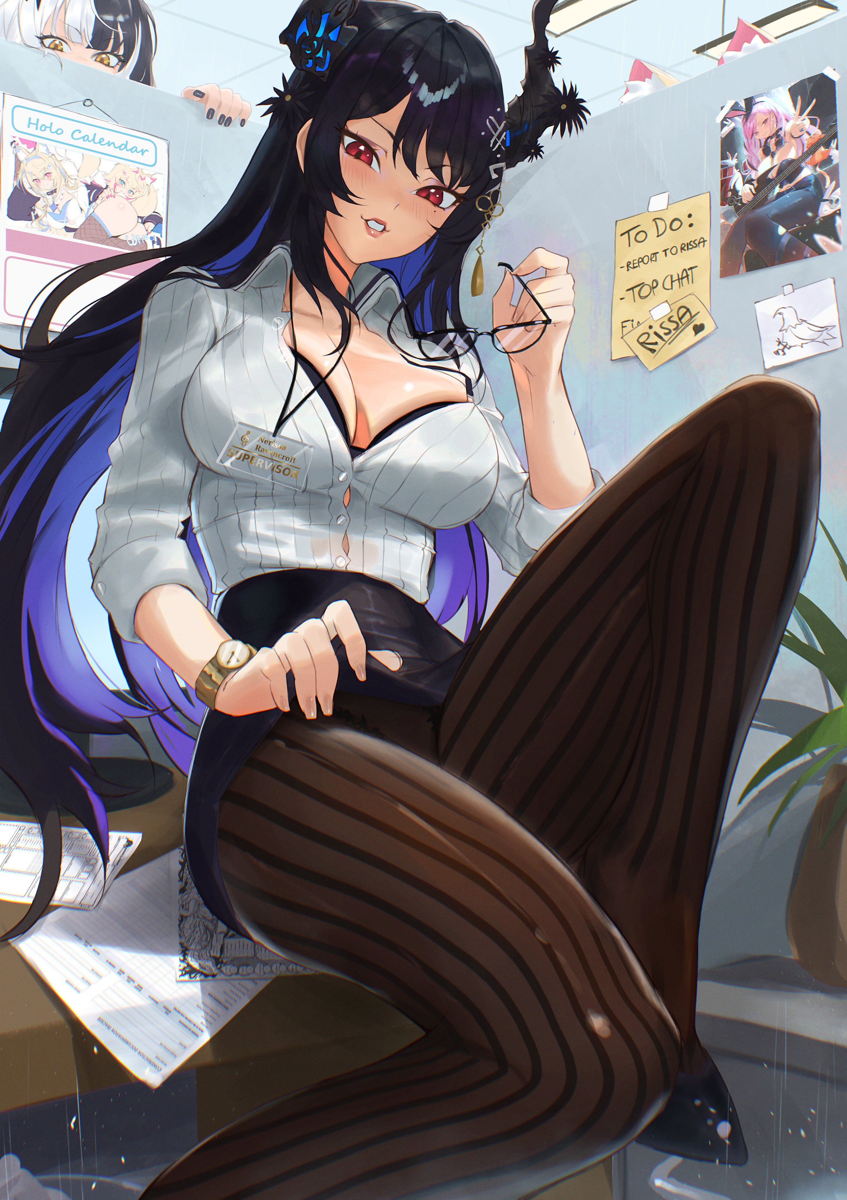 alcoholanimal ear fluffanimal earsasymmetrical hornsbandaidbandaid hair ornamentbare shouldersbass guitarbeltblack collarblack hairblack nailsblack pantsblack skirtblack vestblonde hairblue eyesblue hairblue nailsblurryblurry foregroundblushbreastscatcleavagecollarcolored inner haircropped shirtcrystal hornsdemon hornsdog earsdog girldog taildressdress suitfake animal earsfake hornsfishnet socksfishnetsflowerfrilled shortsfrillsfur trimfur-trimmed jacketgrey hairhair ornamenthairbandheadphonesheadphones around neckholdingholding bass guitarholding instrumenthorn flowerhorn hairbandhornsinstrumentjacketjewelrylarge breastsleatherleather skirtlong hairlooking at viewermolemole under eyemulticolored hairmultiple girlsofficeoffice ladyofficial alternate costumepantspantyhosepencil skirtpink beltpink eyespink hairpink hairbandpurple eyespurple hairrabbit earsred eyesshirtshort hairshortssiblingssisterssittingskirtsmilesockssojusolo focusspiked collarspikessplit-color hairstreaked hairtailtwinstwo-tone hairuneven hornsvvestvirtual youtuberwhite shirtx hair ornamentyellow eyes