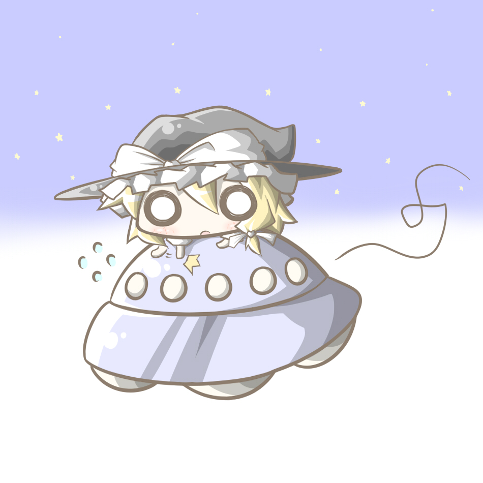 1girlblonde hairchibifemale focusgradient backgroundhair ribbonhato ooutdoorsribbonskysolostar (symbol)ufowhite background