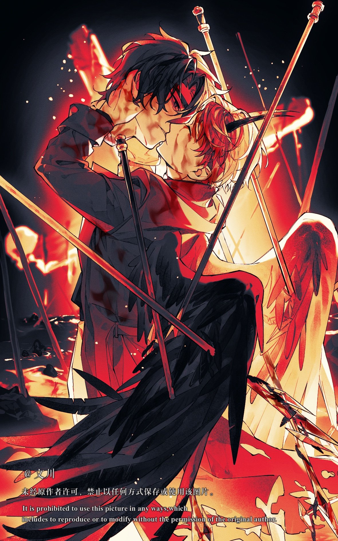 2boysbacklightingblack coatblack eyesblack hairblack wingsbleedingblonde hairbloodblood on clothesblood on facecheon inhoclosed eyescoatcurtained hairdemon hornsfeathered wingshand on another's headhornsimpaledkisskneelinglight particleslooking at anothermultiple boysnicayukoplantedplanted swordplanted weaponswordtoo many weaponstorn clothesweaponwingsyaoi