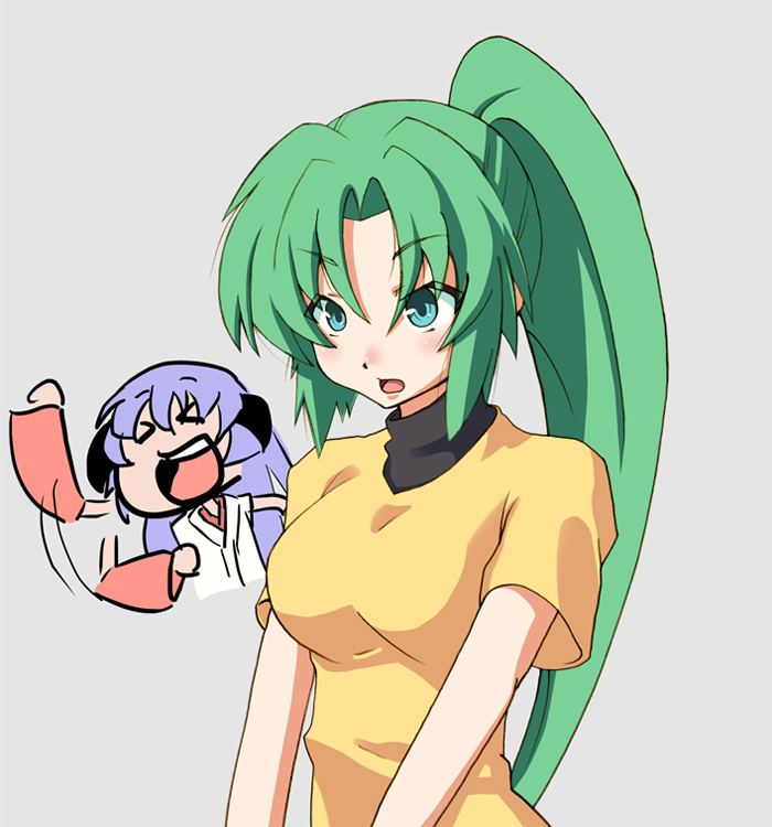 00s2girlsblue eyesbreastsdetached sleevesgreen hairhornsjapanese clotheslarge breastslong hairmikomultiple girlsoppai oppaiponytailpurple hair