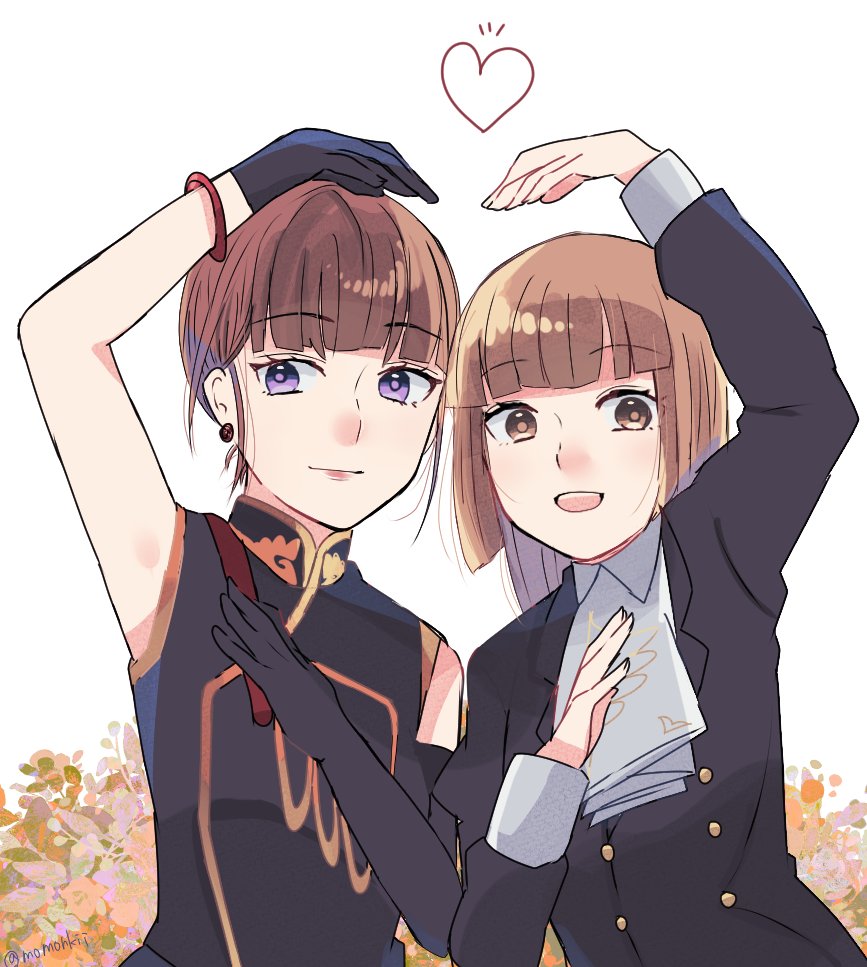 2girlsartist nameblack glovesbrown eyesbrown hairclosed mouthglovesheartheart armsmultiple girlsopen mouthpurple eyessimple backgroundsmilestandingtwitter usernameupper bodywhite background