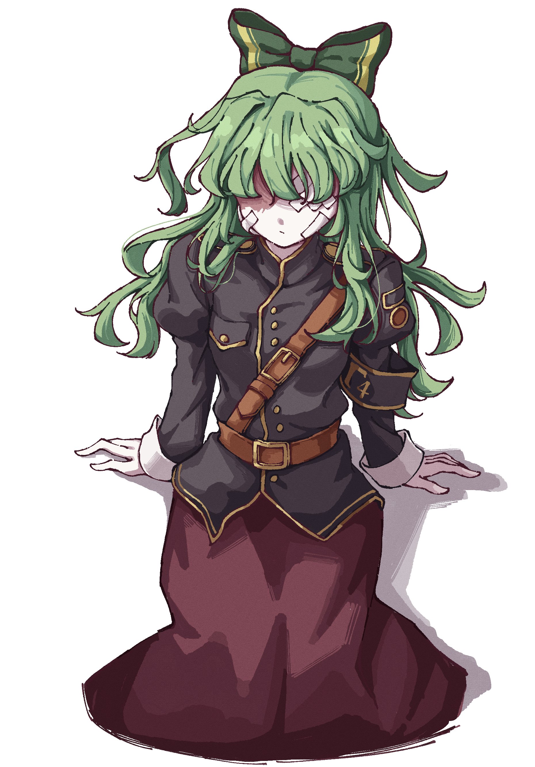 1girlbandaidbeltbowgreen bowgreen hairred skirtsimple backgroundsittingskirtsolowavy hairwhite background