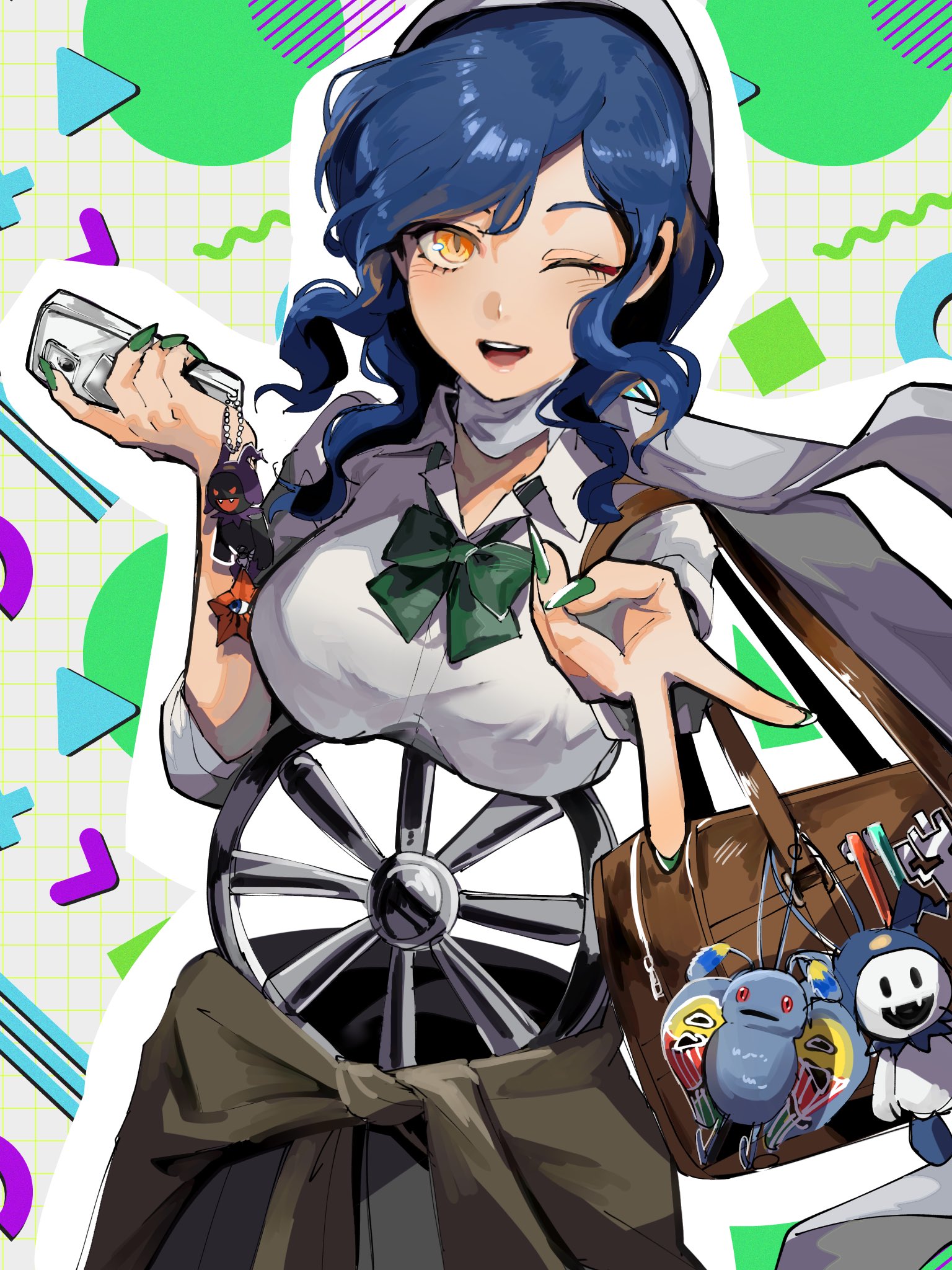 :d1girlbagblue haircharacter charmcharm (object)clothes around waistcollared shirtcowboy shotdemon (megami tensei)fingernailsgreen nailsgyaru vholdingholding phonejacketjacket around waistlong fingernailslooking at viewermedium hairopen mouthphoneschool bagschool uniformshirtslit pupilssmilesoloteethupper teeth onlyvwhite shirtyellow eyes