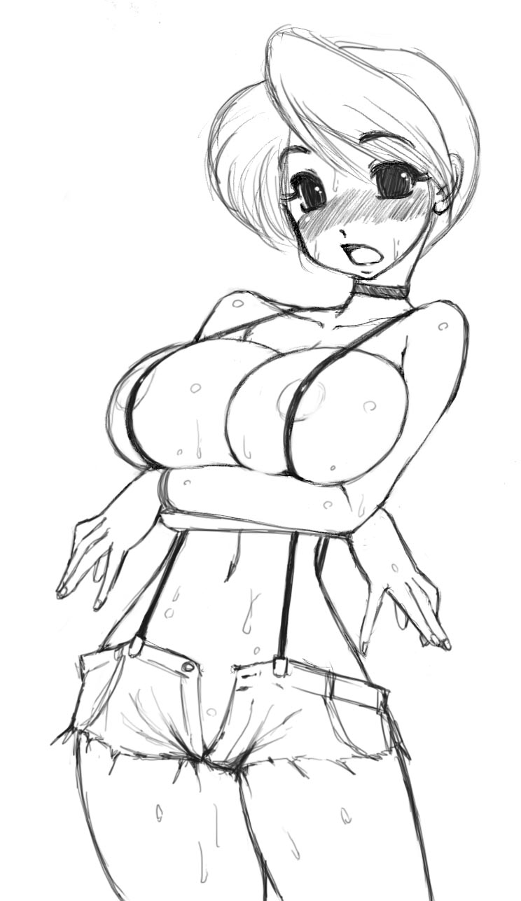 bare shouldersblushbreastschokergreyscalehuge breastsmidriffmonochromenaked suspendersnavelnipplesshort hairshort shortsshortssketchsolosuspenderssweat