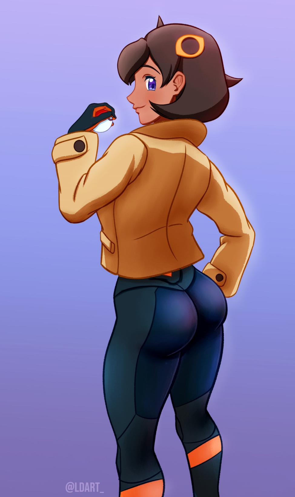 1girlaged upassblack bodysuitblack hairbodysuitbodysuit under clothesbrown jacketclosed mouthdark skindark-skinned femalefrom behindgloveshair between eyeshair ornamenthand on own hiphand upholdingholding poke balljacketlatexlatex bodysuitldartslooking at viewerpoke ballpoke ball (basic)pokemon (creature)purple backgroundpurple eyesshort hairsidelockssimple backgroundskin tightsmilesolostandingswept bangstwitter username