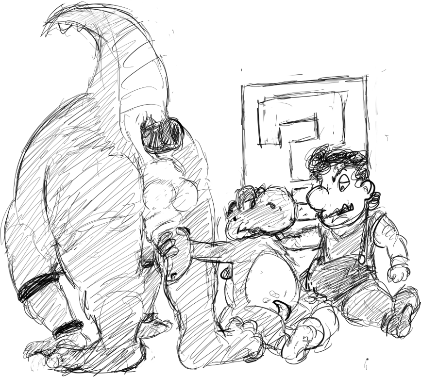 erm nkcn, draluc (kyuuketsuki sugu shinu), ronaldo (kyuuketsuki sugu shinu), kyuuketsuki sugu shinu, highres, 2boys, ascot, black hair, black pants, black vest, blush, colored skin, embarrassed, fingernails, flying sweatdrops, grey hair, hand on another's waist, holding hands, male focus, multiple boys, musical note, open mouth, pants, pointy ears, purple skin, red eyes, shirt, short hair, signature, vampire, vest, white ascot, white shirt, yaoi, yellow background