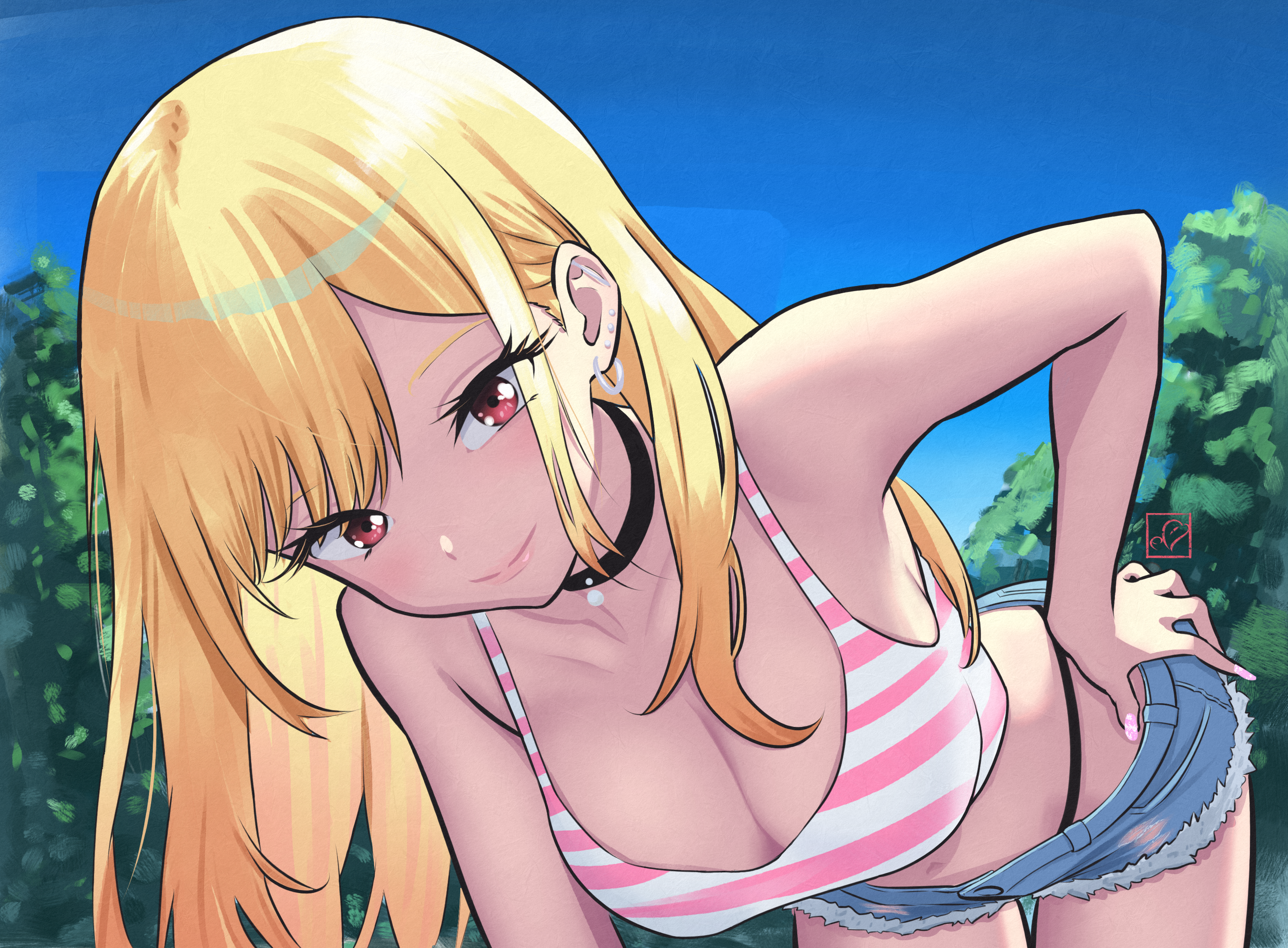 1girlbent overblack chokerblonde hairbreastschokercleavagecowboy shotcrop topcutoffsdaydenimdenim shortseyelashesfingernailshand on own hiplarge breastsleaning forwardlipslong fingernailslong hairlooking at viewermidriffoutdoorspanty strapspink nailspink tank topred eyesshort shortsshortssolostriped tank toptank topthigh gaptreewhite tank top