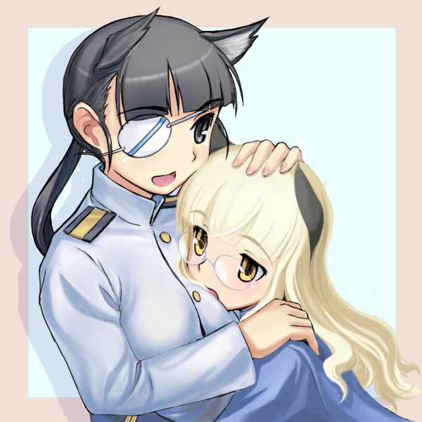 00s2girlsanimal earsblack hairblonde haireyepatchglasseshand on another's headhuglong hairmultiple girlsponytailyellow eyes