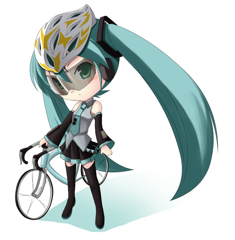 aqua hairbicyclechibidetached sleevesgreen eyeshelmetlong hairnecktieskirtsolosunglassesthighhighstwintails