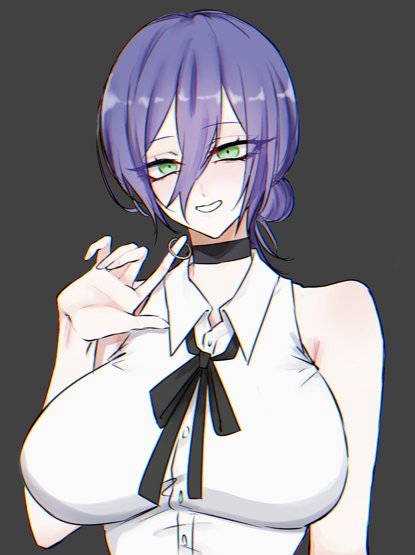 1girlblack chokerblack ribbonblue hairbreastschokercollared shirtgreen eyesgrenade pingrey backgroundgrinhair between eyeshair bunhuge breastslooking at viewerneck ribbonribbonshirtsimple backgroundsleevelesssleeveless shirtsmilesoloteethwhite shirt
