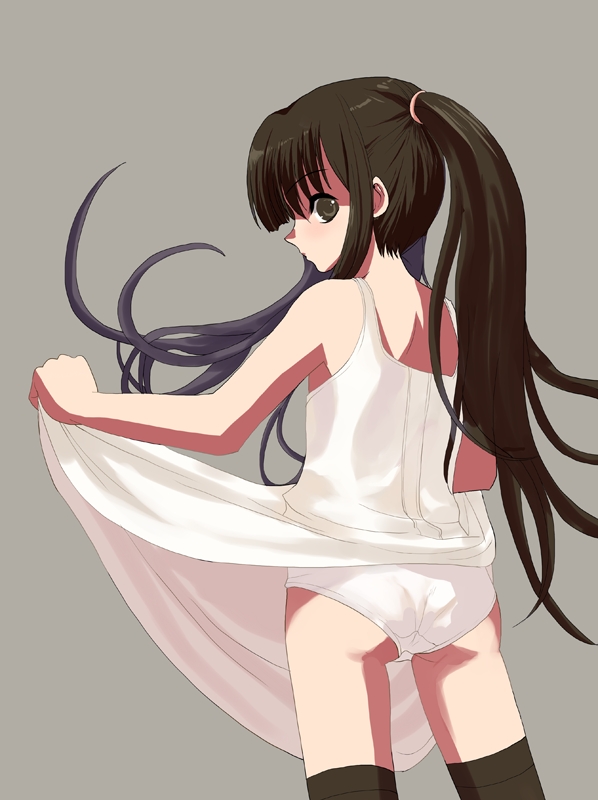 1girlassblack eyesblack hairclosed mouthclothes liftdressdress liftfemale focusfrom behindlolilong hairlooking backpaint.net (medium)pantiesskirtskirt liftsolothighhighstwintailsunderwear