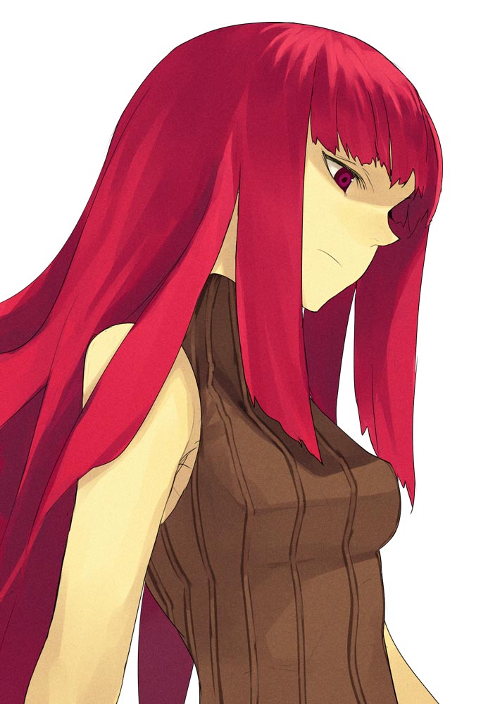 bare shouldersfrom belowlong hairlooking downred eyesred hairsleevelesssleeveless turtlenecksoloturtleneck