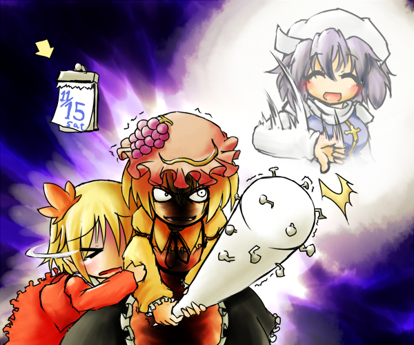 :d1boy3girlsarrow (symbol)baseball batblonde hairblushcalendar (object)chibiclosed eyescrazy eyescrossdaikonevil grinevil smilefemale focusgrinhair ornamenthatleafleaf hair ornamentmultiple girlsnail (hardware)nail batopen mouthradishscaredshaded faceshort hairsmiletearsthumbs downtremblingweapon