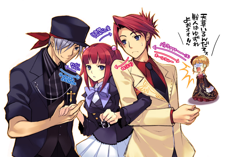tudurimike, avery (pokemon), burgh (pokemon), jacq (pokemon), wallace (pokemon), nintendo, pokemon, pokemon bw, pokemon rse, pokemon sv, pokemon swsh, commentary request, highres, 4boys, :d, ;d, alternate costume, black shoes, blonde hair, brown hair, chibi, chibi only, glasses, green eyes, green hair, hat, jacket, male focus, multiple boys, necktie, one eye closed, open mouth, pants, purple hair, purple necktie, round eyewear, shoes, smile, standing, top hat, white hat, white jacket, white pants